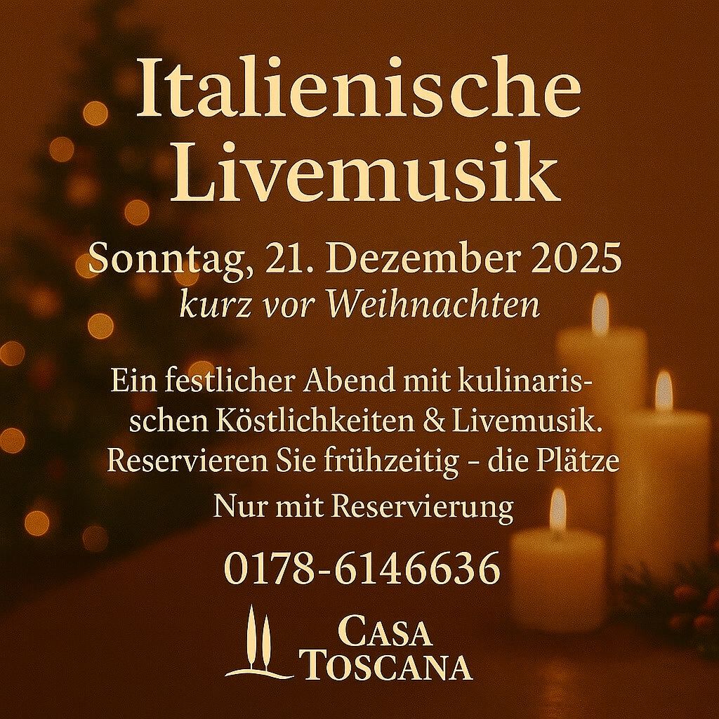 Am Sonntag, 21.Dezember 2025 laden wir Sie zu einem besonderen Abend mit Livemusik & kulinarischen Köstlichkeiten ein.